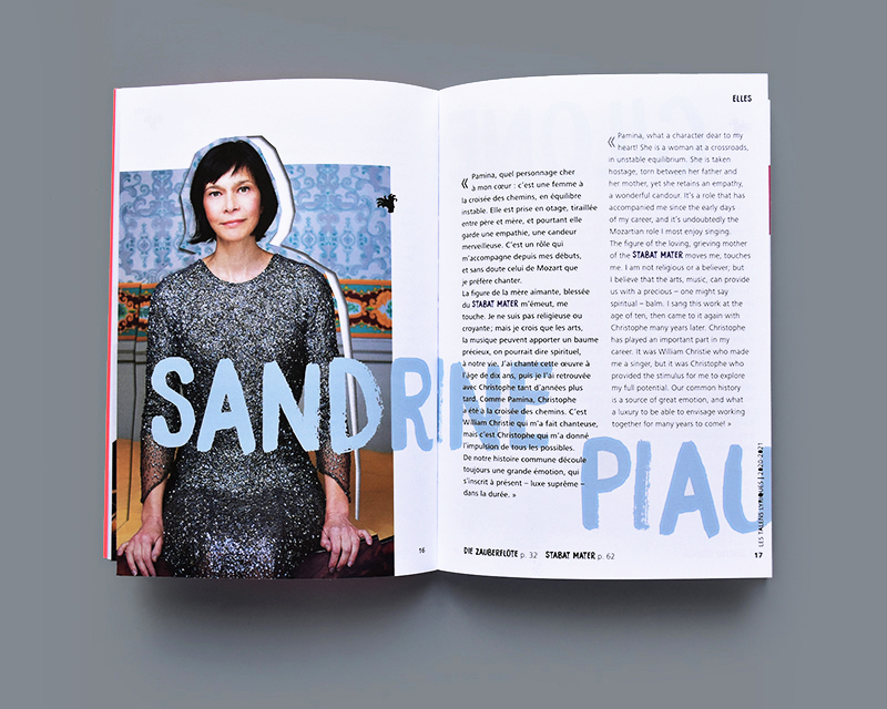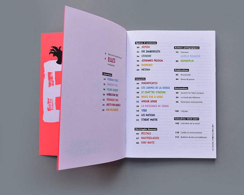 Conception graphique de la brochure de saison de l'ensemble de musique Les Talens Lyriques, dirigé par Christophe Rousset. La saison rend hommage aux figures féminines de a musique baroque et à leurs interprètes.