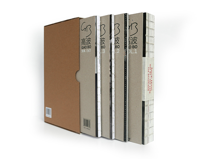 catalogue de l’exposition “Les Offrandes” de Gao Bo à la Maison européenne de la photographie. Conçus en collaboration avec l’artiste, 3 volumes présentent les œuvres comme un flot d’images archivées, montrant le développement de chaque série, de la photographie à la mise en espace et aux performances, classées dans des dossiers au design volontairement bruts. Un 4e tome comprend tous les textes et fait l’objet de deux éditions: l’une en français-anglais et l’autre chinois-anglais.