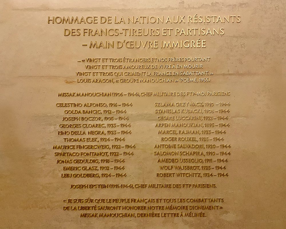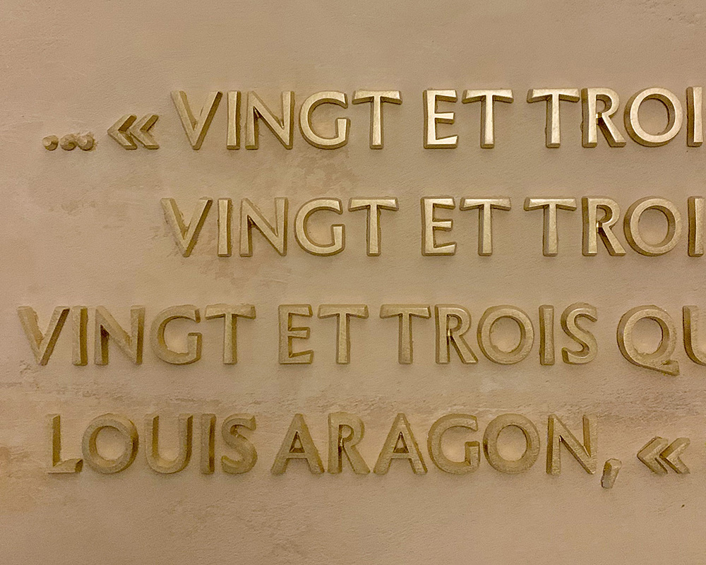 À l’occasion de l’entrée de Missak et Mélinée Manouchian au Panthéon, conseil typopgraphique, conception graphique et suivi de réalisation des lettres de bronze de l’inscription en hommage aux Vingt-trois de l'Affiche Rouge (FTP–MOI).